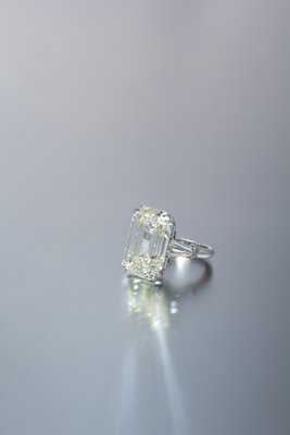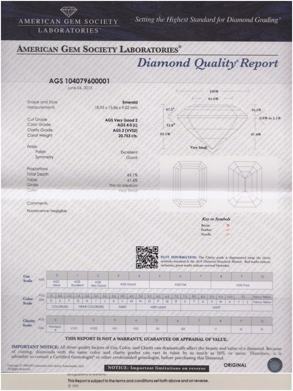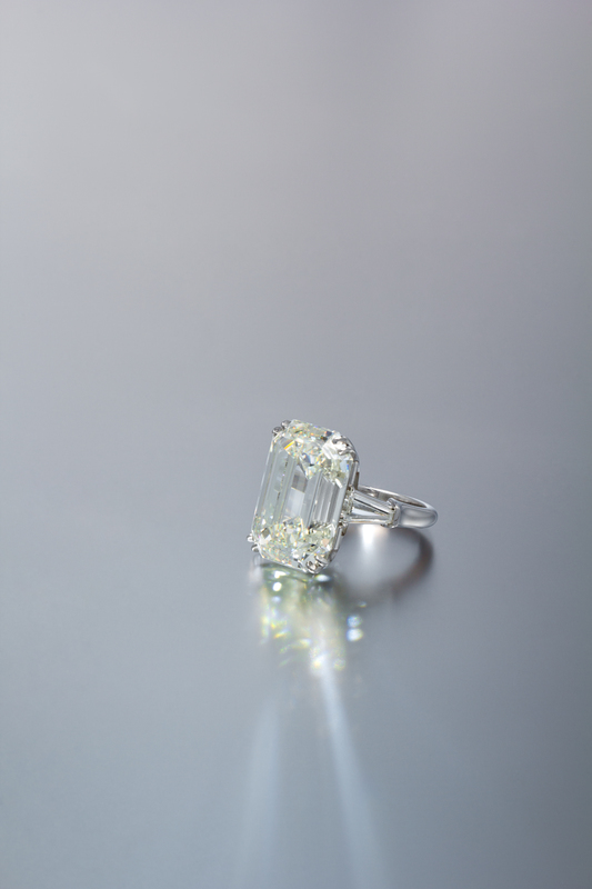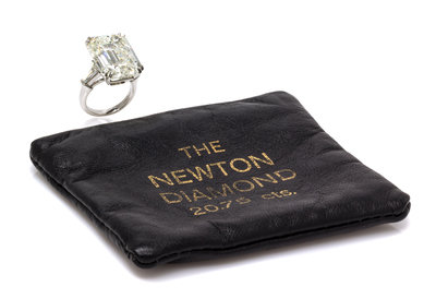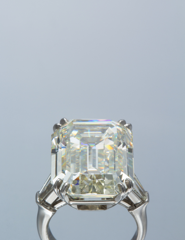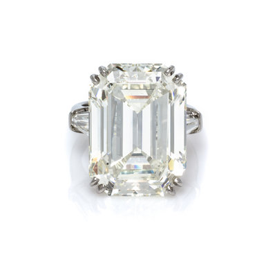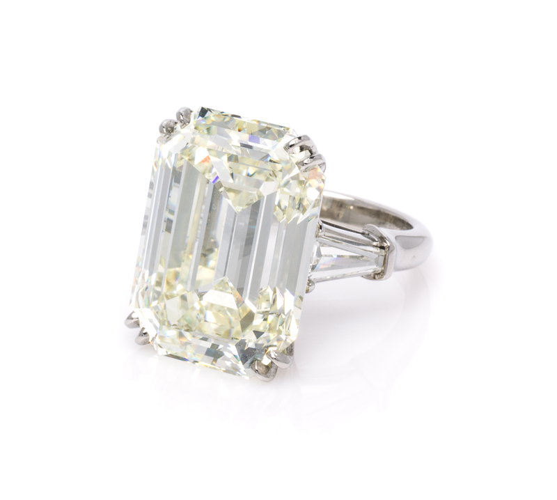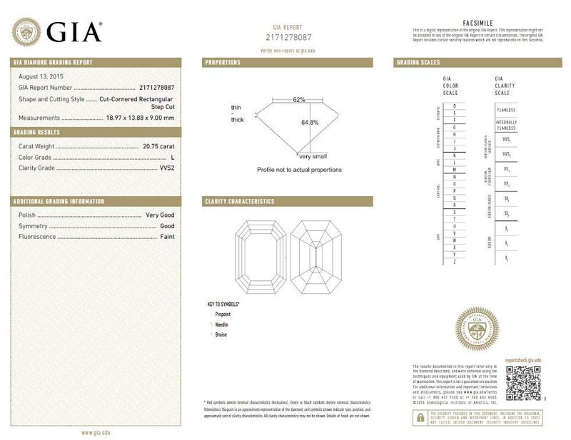 consisting of a 20.75 carat octagonal step cut diamond within a platinum double claw setting with two tapered baguette diamonds weighing approximately 0.90 carat total.Stamp: HANDMADE 10%IRIDPLAT.Accompanied by a Gemological Institute of America diamond grading certificate number 2171278087, dated August 13, 2015, stating Weight: 20.75 carats, Color: L, Clarity: VVS2, Polish: Very Good, Symmetry: Good, Fluorescence: Faint.Accompanied by an American Gem Society Laboratories diamond quality report 104079600001, dated June 04, 2015, stating Weight: 20.753 carats, Color: AGS 4.0 (L), Clarity: AGS 2 (VVS2), Polish: Excellent, Symmetry: Good, Fluorescence: Negligible.Provenance:The present lot, a superbly fashioned emerald cut diamond of impressive scale, was commissioned for Wayne Newton's first wife on the occasion of her birthday.Diamonds in excess of 20.00 carats finished weight or more represent an extraordinarily minute percentage of overall production and require a rough crystal 150-200% larger than the finished weight. Accompanied by a black leather pouch signed THE NEWTON DIAMOND 20.75.