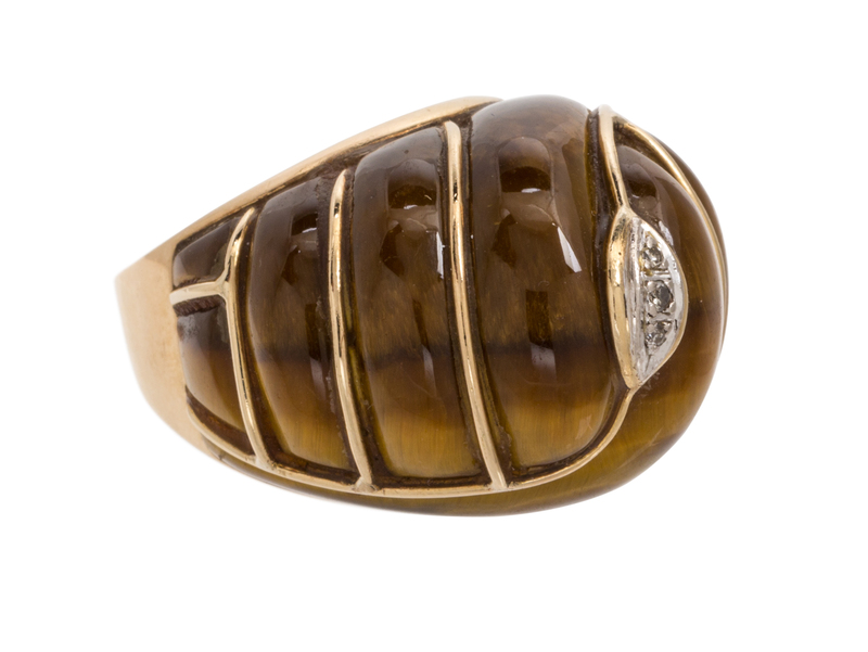 containing a spiral carved tiger's eye accented with gold wire and three round brilliant cut diamonds.Stamp: 14K.