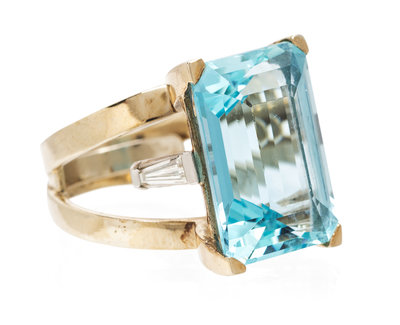 containing one octagonal step cut aquamarine measuring approximately 21.50 x 14.90 x 9.20 mm and two tapered baguette cut diamonds weighing approximately 0.40 carat total.