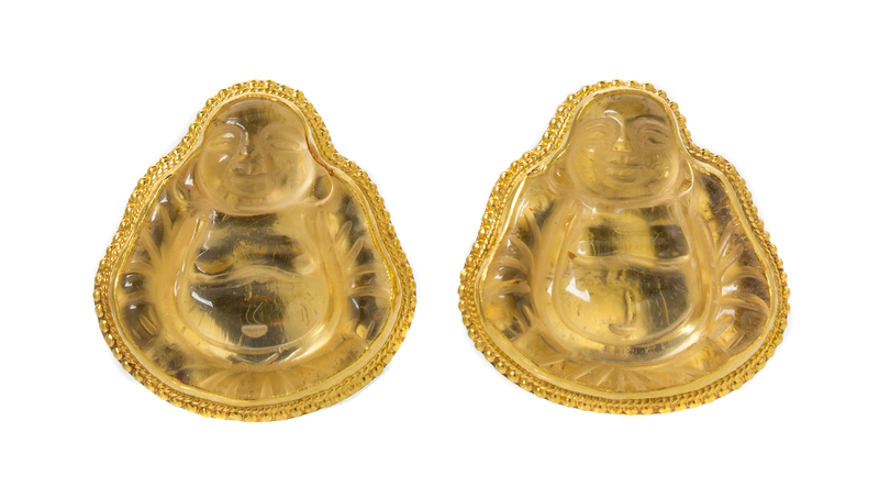 consisting of two carved citrine Buddhas set within conforming high karat gold bezel settings with beaded texture, the earclips measure approximately 34.90 x 34.90 mm.Stamp: 22K 24K (maker's mark H F in script).