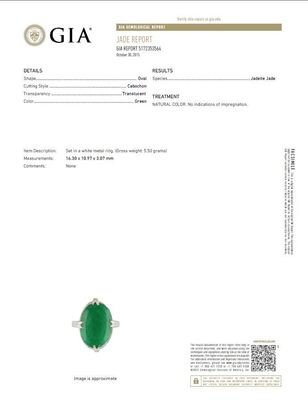 containing one oval cabochon cut jadeite jade measuring approximately 17.60 x 12.40 x 3.01 mm.Stamp: 14K.Accompanied by a Gemological Institute of America jade identification certificate number 5172353564, dated October 30, 2015, stating Species: Jadeite Jade, Color: Green, Transparency: Translucent, Treatment: No indications of impregnation.