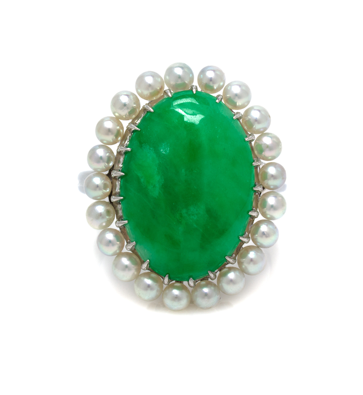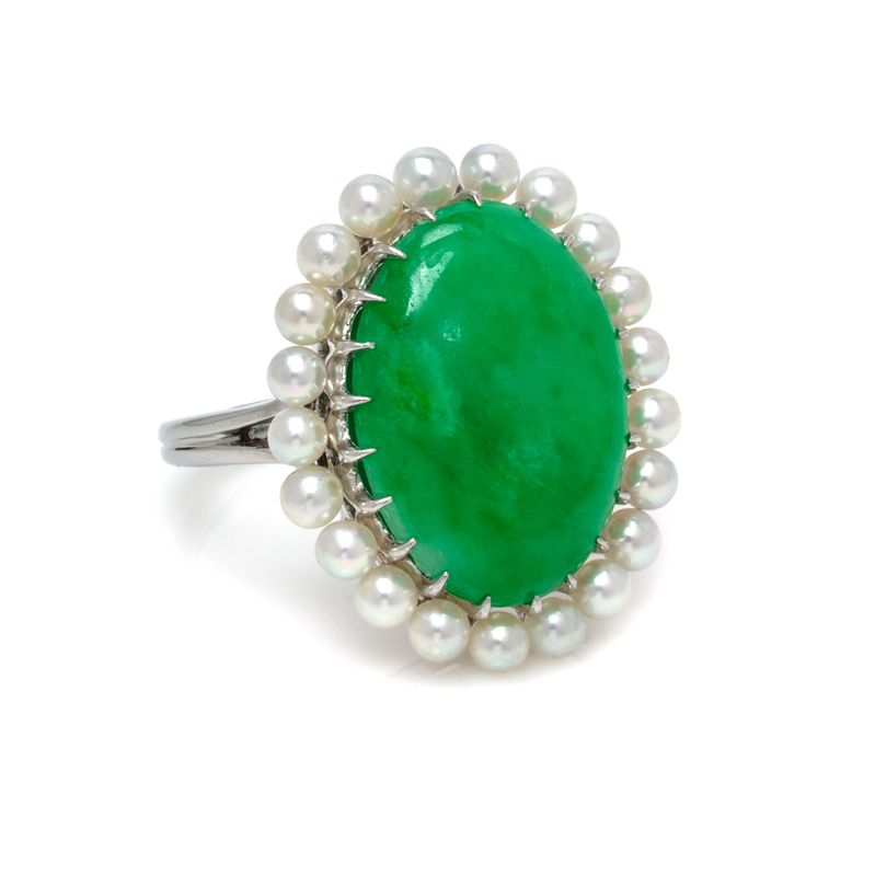 A Platinum, Jadeite Jade and Cultured Pearl Ring,