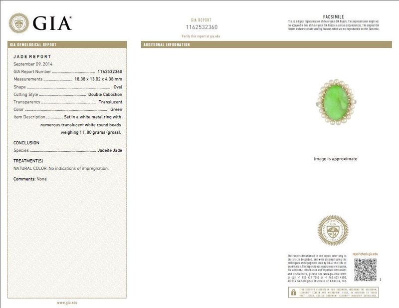 containing one oval cabochon cut jade measuring approximately 18.38 x 13.02 x 4.38 mm in a multi claw prong setting surrounded by 21 pearls measuring approximately 3.00 mm in diameter.Stamp: 10% IRID PLAT.Accompanied by a Gemological Institute of America jade identification certificate number 1162532360, dated September 09, 2014, stating Species: Jadeite Jade, Treatment: Natural Color, No Indications of Impregnation, Transparency: Translucent, Color: Green.