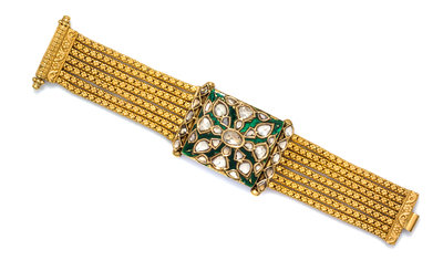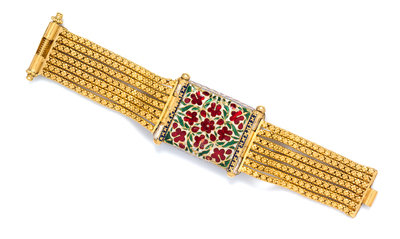A High Karat Yellow Gold, Diamond and Polychrome Enamel Bracelet, Rajasthan,