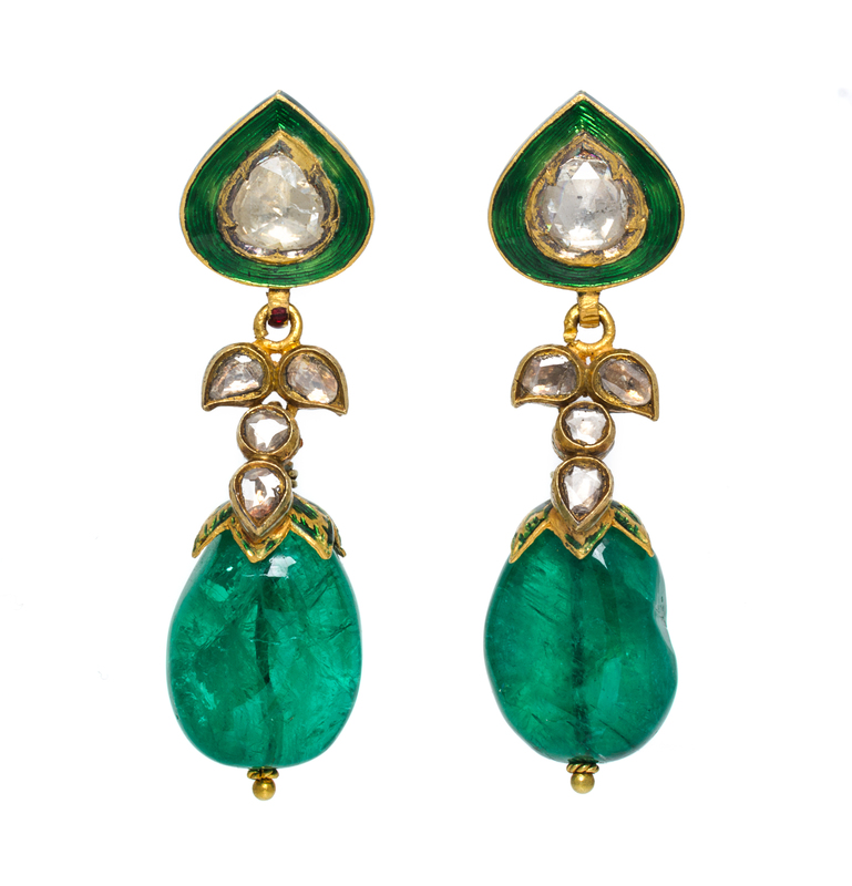 A Pair of Yellow Gold, Emerald, Diamond and Polychrome Enamel Earrings, Deccan,