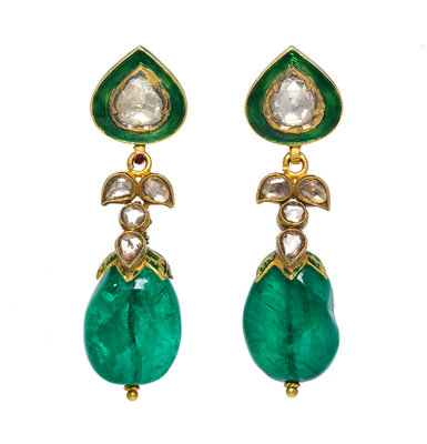 containing two rose cut diamonds, eight pear and round shape lasque cut diamonds and two emerald beads measuring approximately 17.98-18.28 mm in length.