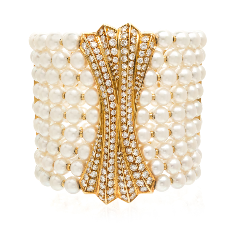 retailed by Neiman Marcus, containing 190 round pearls measuring approximately 5.15-6.40 mm in diameter and 170 round brilliant cut diamonds weighing approximately 6.52 carats total.Stamp: 18K 750 (Italian assay marks).Accompanied by a Neiman Marcus box.