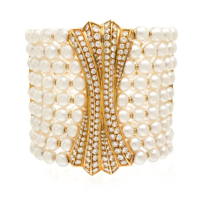 An 18 Karat Yellow Gold, Cultured Pearl and Diamond Cuff Bracelet,