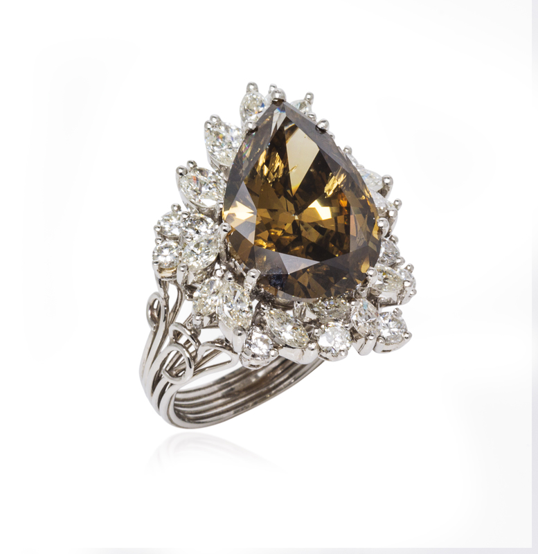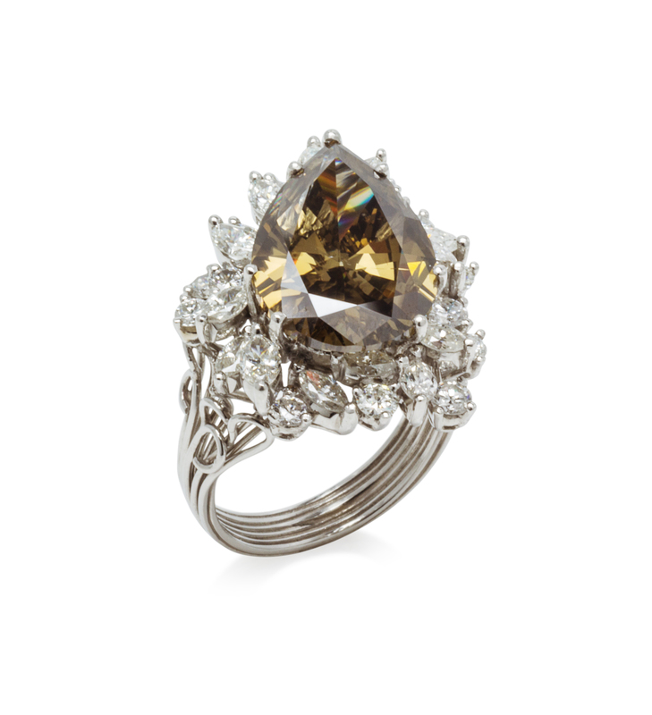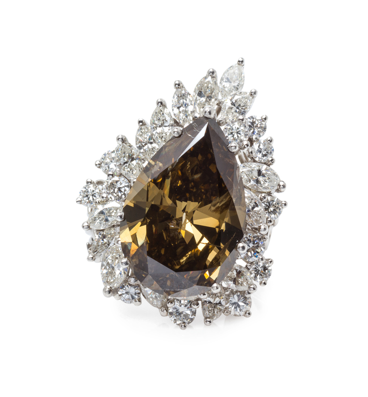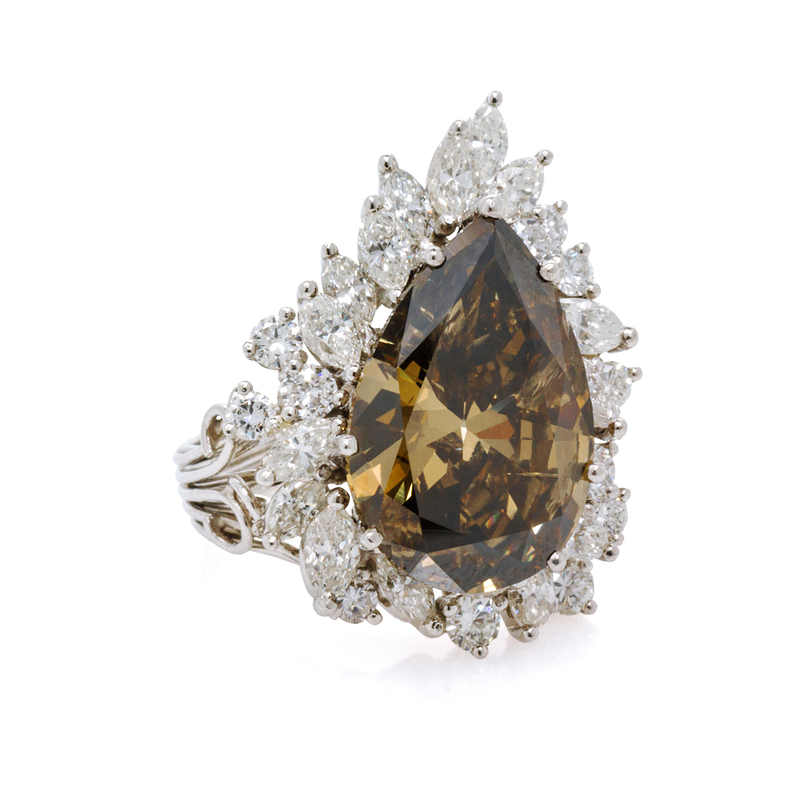 containing one pear shape brown color diamond weighing approximately 9.58 carats, 16 marquise cut diamonds weighing approximately 2.08 carats total, and 12 round brilliant cut diamonds weighing approximately 0.96 carat total.Stamp: PLAT.Accompanied by a Gemological Institute of America colored diamond grading certificate number 5172352485, dated October 21, 2015, stating Color: Fancy Dark Brown, Natural, Clarity: I1, Polish: Good, Symmetry: Good, Fluorescence: None.