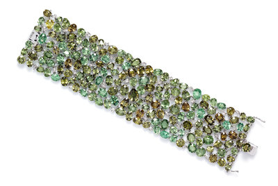 designed as a meshwork of interconnected basket settings, containing numerous oval, pear, cushion, and triangular demantoid garnets weighing approximately 188.50 carats total interspersed with numerous oval, pear, cushion and marquise shape rose cut diamonds weighing approximately 2.20 carats total.Stamp: 18K 750 D3518 188.50 D2.20.