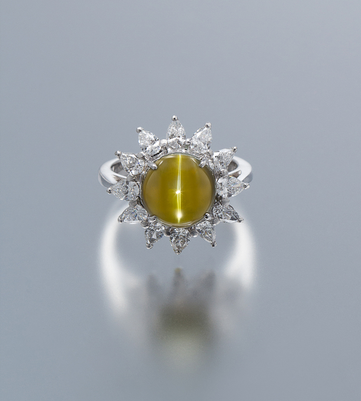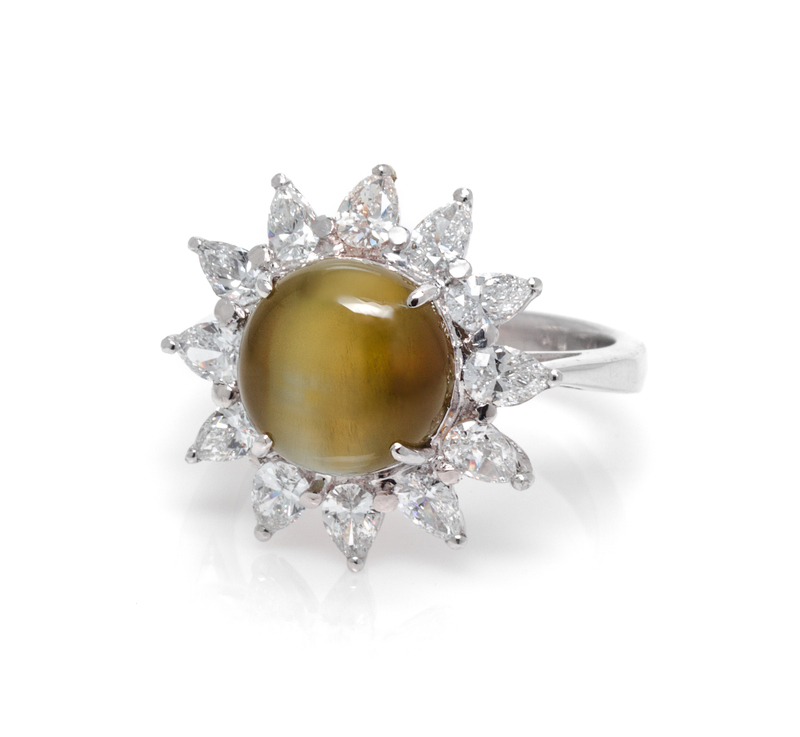 containing one round cabochon cut cat's eye chrysoberyl weighing approximately 6.18 carats and 12 pear shape diamonds weighing approximately 1.34 carats total.