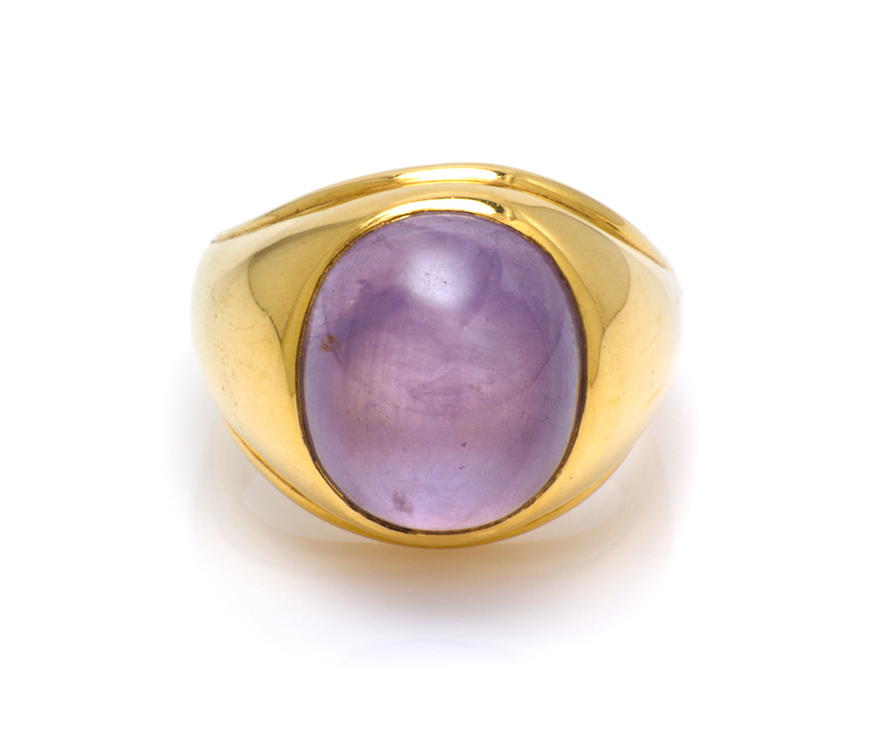 containing one oval cabochon cut purple star sapphire measuring approximately 13.08 x 12.25 x 8.74 mm.Stamp: 22K.