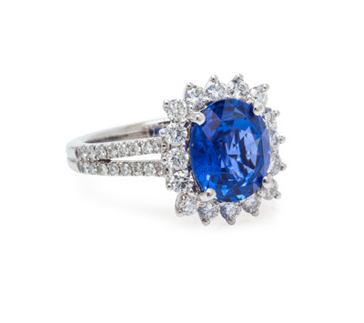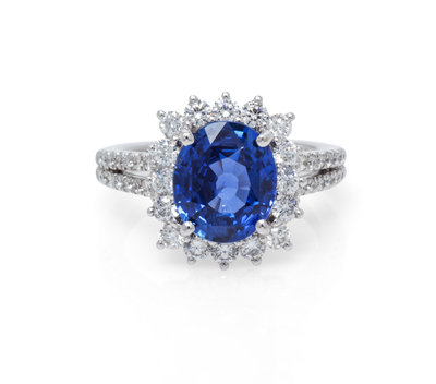 containing one oval mixed cut sapphire measuring approximately 9.99 x 8.58 x 5.34 mm and numerous round brilliant cut diamonds weighing approximately 1.00 carat total.Stamp: 14K ND.