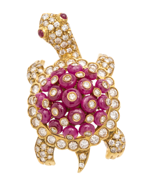 An 18 Karat Yellow Gold, Ruby and Diamond Turtle Brooch, Giovane,