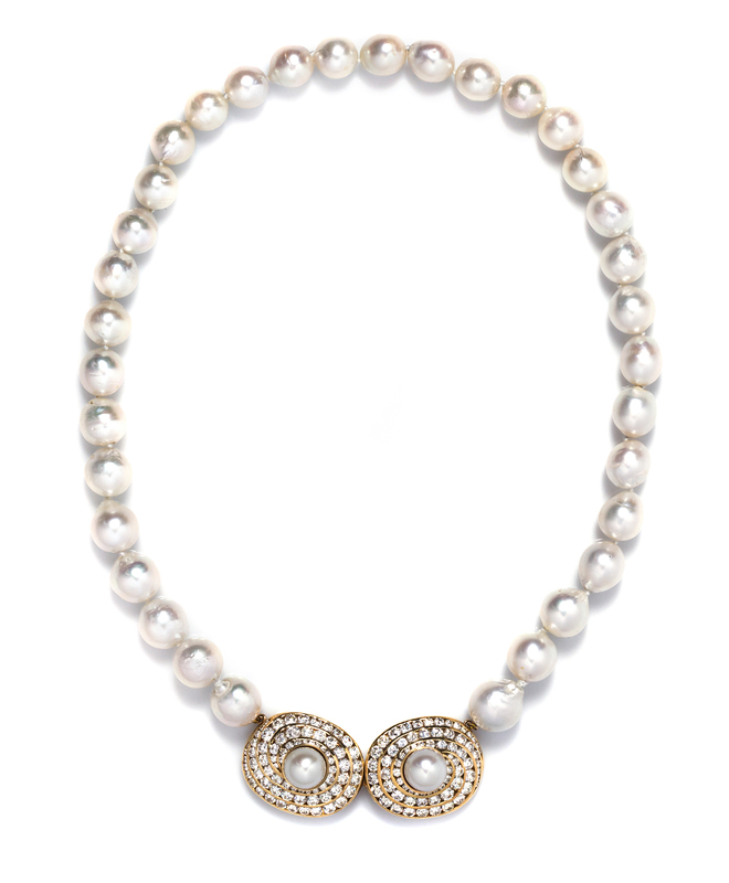 consisting of 34 baroque pearls measuring approximately 10.40-13.20 mm in diameter strung knotted and supporting a central yellow gold double lobe pendant/clasp containing 146 round brilliant cut diamonds weighing approximately 10.00 carats total and two removable pearl accents that can be worn as earrings.Stamp: 18K EM.