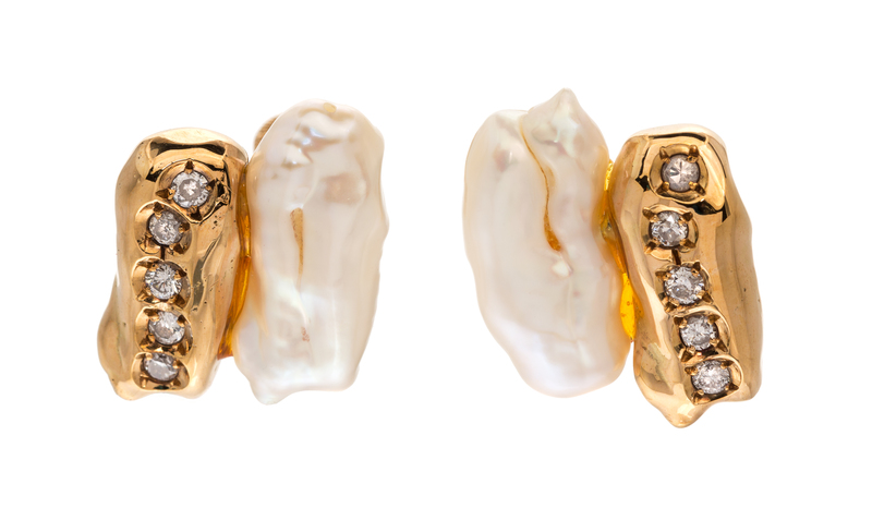 containing two baroque pearls measuring approximately 17.26 x 8.72 mm and 19.12 x 8.50 mm respectively, the pearls joined to sculpted gold sections containing ten round brilliant cut diamonds weighing approximately 0.36 carat total.Hand engraved: Cartier Paris. Stamp: (French assay marks) 03614.