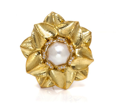 centered on one mabe pearl measuring approximately 18.55 mm in diameter within a surround of seven crescent shape sections containing 21 round brilliant cut diamonds weighing approximately 0.42 carat total, the outer border composed of an overlapping hammered texture petal motif.Stamp: 18K 750 (Italian maker's mark).