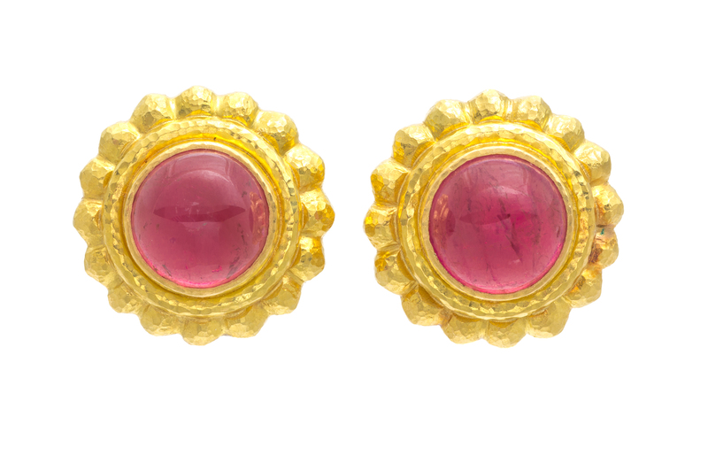containing two round cabochon cut pink tourmaline measuring approximately 9.50 mm in diameter within hammered texture fluted settings.Stamp: (Maker's mark EL for Elizabeth Locke) 18K.
