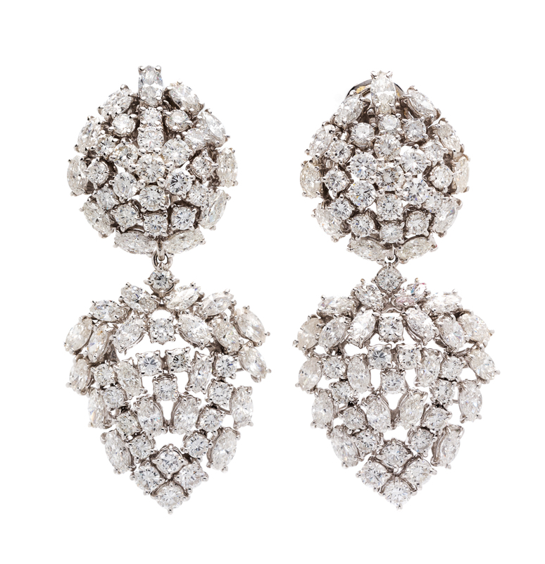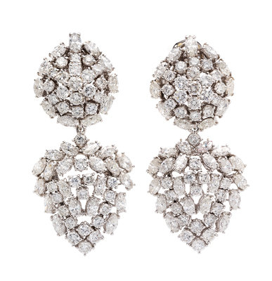 in a day/night design, consisting of openwork tops and detachable drop pendants, containing 62 marquise cut diamonds weighing approximately 8.70 carats total and 70 round brilliant cut diamonds weighing approximately 5.70 carats total. Stamp: 750 Giovane.