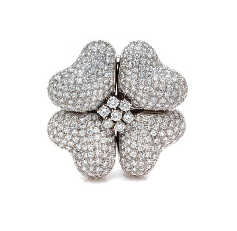 in a domed four petal design surrounding a central cluster setting, the brooch containing numerous round brilliant cut diamonds weighing approximately 9.00 carats total.