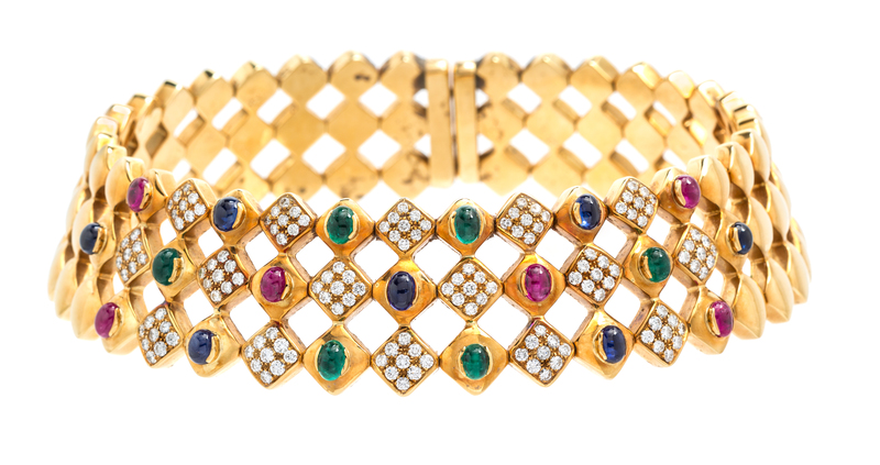 containing 144 round brilliant cut diamonds weighing approximately 7.34 carats total, seven oval cabochon cut emeralds weighing approximately 7.35 carats total, six oval cabochon cut emeralds weighing approximately 4.26 carats total, and six oval cabochon cut rubies weighing approximately 6.36 carats total. Stamp: 750 (Italian maker's mark).
