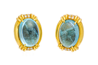 A Pair of 18 Karat Yellow Gold, Aquamarine and Diamond Earclips, Gump's,