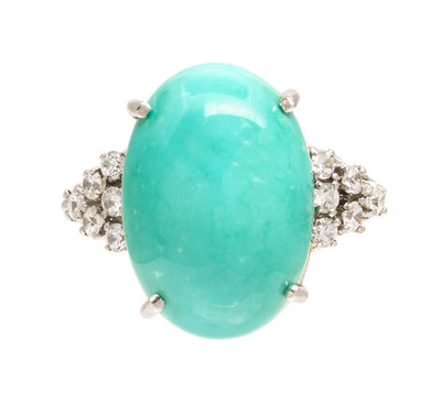 containing one oval cabochon cut turquoise measuring approximately 18.52 x 12.86 mm and 24 round brilliant cut diamonds weighing approximately 0.66 carat total.Stamp: Platinum (partially obscured).