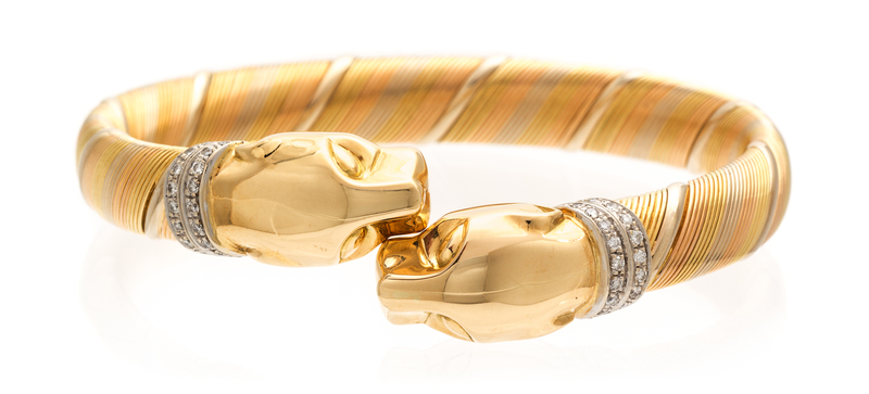 An 18 Karat Tri Color Gold and Diamond Panthere Bypass Bracelet, Cartier, Circa 1990,