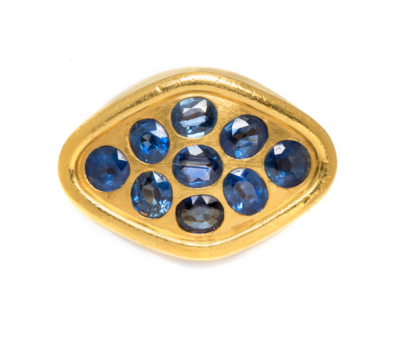 the lozenge form setting containing two round mixed cut sapphires measuring approximately 4.75 mm in diameter and seven oval mixed cut sapphires measuring approximately 5.06 x 4.40 mm to 5.70 x 4.70 mm. Stamp: (Maker's mark depicting a letter "S" within a shield).
