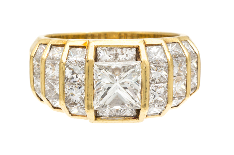 containing one princess cut diamond weighing approximately 1.34 carats and 26 channel set princess cut diamonds weighing approximately 2.63 carats total. Stamp: 18KScratch marks: 1295.