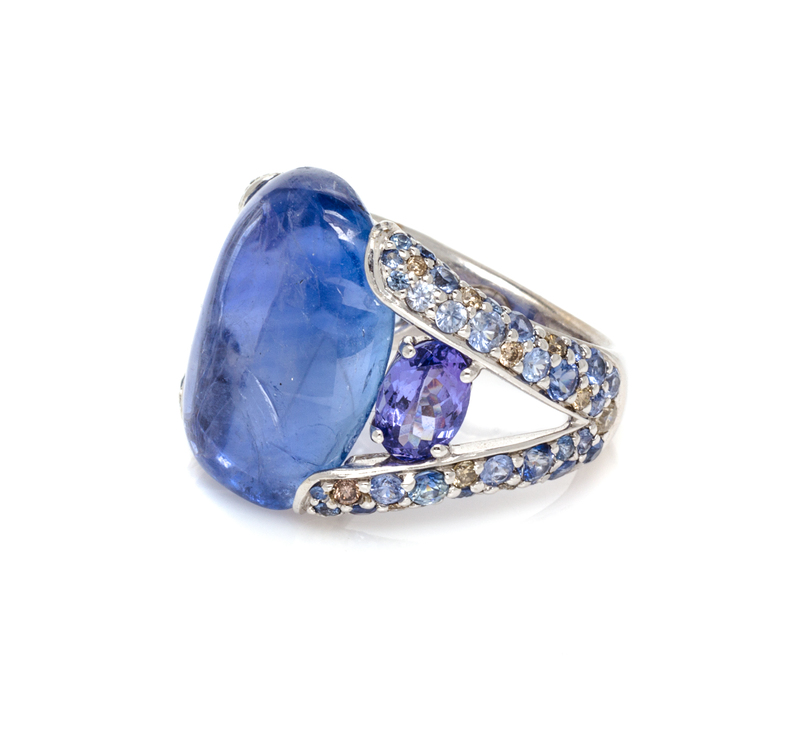 containing a central saddle cut sapphire measuring approximately 19.11 x 13.79 x 6.39 mm, two oval mixed cut tanzanite measuring approximately 6.90 x 4.90 mm, the bifurcated shoulders pave set with numerous round mixed cut sapphires in various hues including pale blue, pale yellow and near colorless.Stamp: 18K R3210.