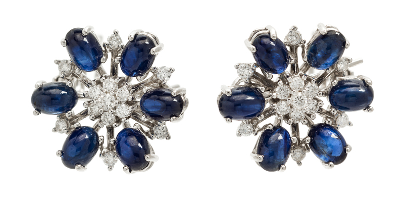 containing 12 oval cabochon cut sapphires weighing approximately 10.50 carats total and 26 round brilliant cut diamonds weighing approximately 0.56 carat total, collapsible posts.Stamp: 18K 750.