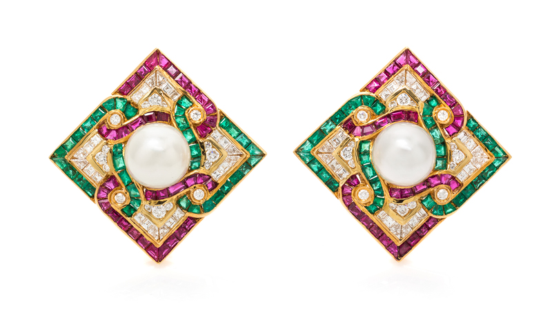 containing two pearls measuring approximately 12.11-12.46 mm in diameter, the pearls within square surrounds of an interlocking spiral motif, the settings containing 32 round brilliant cut diamonds weighing approximately 0.72 carat total, 32 square step and baguette cut diamonds weighing approximately 1.60 carats total, 16 fancy baguette cut diamonds measuring approximately 3.60 x 2.22 mm, 72 calibre cut emeralds weighing approximately 4.68 carats total, and 72 calibre cut rubies weighing approximately 5.75 carats total.Stamp: 750.