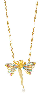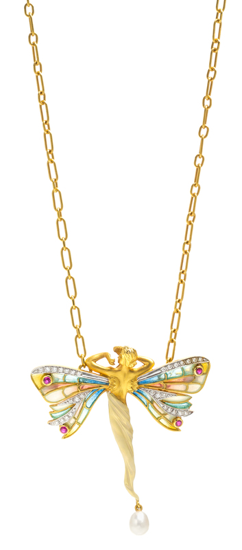 An 18 Karat Yellow Gold, Diamond, Ruby, Cultured Pearl and Polychrome Plique-a-Jour Pendant, Masriera,