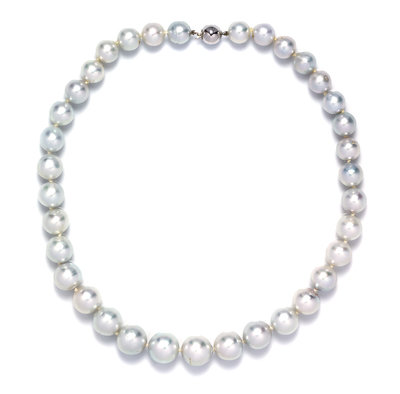 consisting of 35 pearls measuring approximately 11.09-15.24 mm in diameter strung knotted with a white gold boule clasp. Clasp stamp: 750.