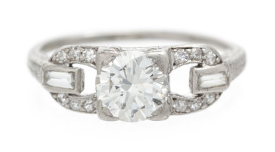 containing one old European cut diamond weighing approximately 0.90 carat, two baguette cut diamonds weighing approximately 0.10 carat total, and 12 round single cut diamonds weighing approximately 0.12 carat total.