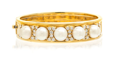 An 18 Karat Yellow Gold, Cultured Pearl and Diamond Bracelet,