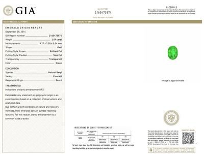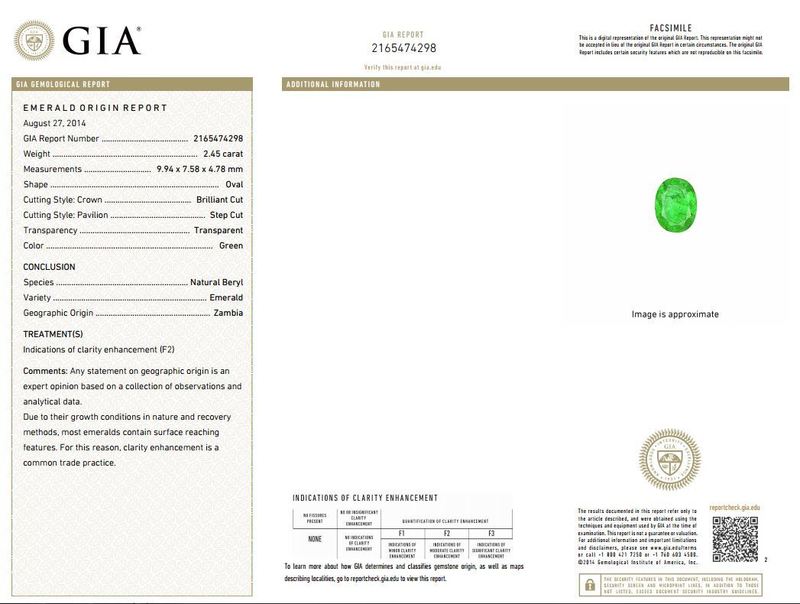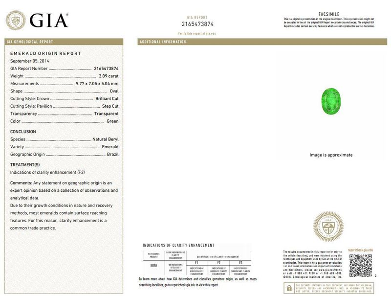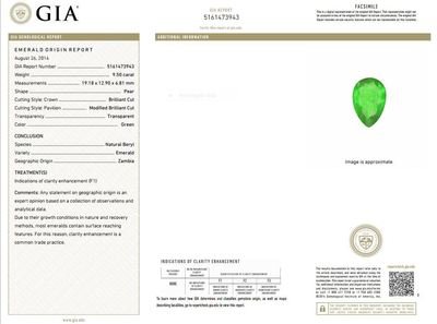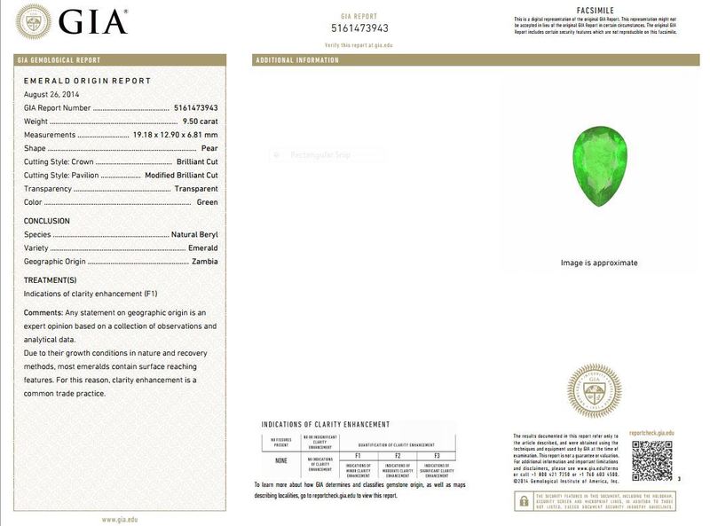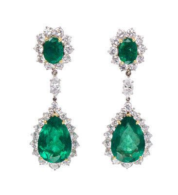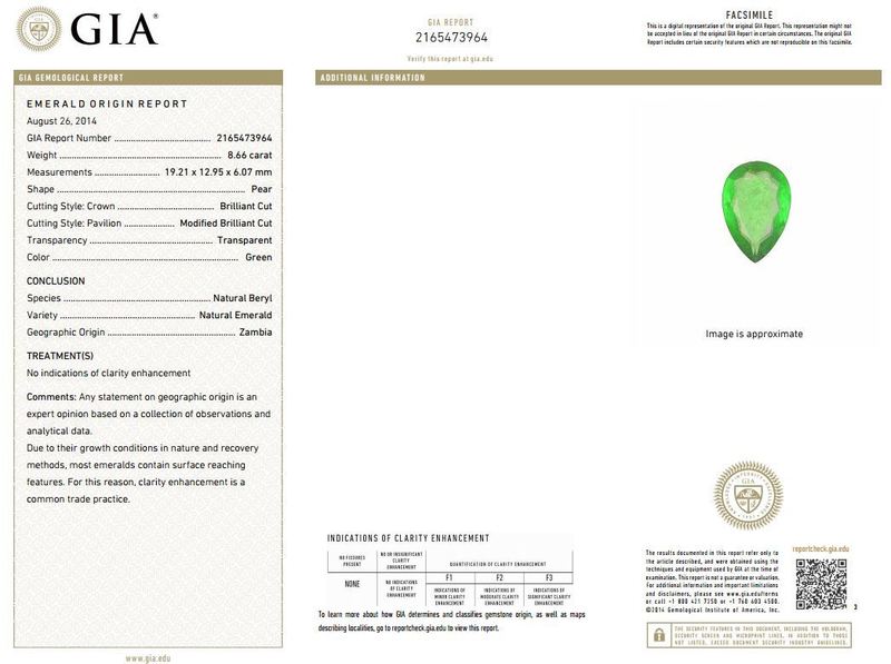 containing two oval mixed cut emeralds weighing approximately 4.54 carats total, two pear shape mixed cut emeralds weighing approximately 18.16 carats total, 56 round brilliant cut diamonds weighing approximately 7.90 carats total and two marquise cut diamonds weighing approximately 0.70 carat total.Stamp: 1037. Accompanied by a Gemological Institute of America emerald origin report number 5161473943, dated August 26, 2014, stating Mineral Type: Natural Beryl, Variety: Emerald, Origin: Zambia, Clarity Enhancement: Minor, Weight: 9.50 carats.Accompanied by a Gemological Institute of America emerald origin report number 2165473964, dated August 26, 2014, stating Mineral Type: Natural Beryl, Variety: Emerald, Origin: Zambia, Clarity Enhancement: None, Weight: 8.66 carats.Accompanied by a Gemological Institute of America emerald origin report number 2165474298, dated August 27, 2014, stating Mineral Type: Natural Beryl, Variety: Emerald, Origin: Zambia, Clarity Enhancement: Moderate, Weight: 2.45 carats.Accompanied by a Gemological Institute of America emerald origin report number 2165473874, dated September 05, 2014, stating Mineral Type: Natural Beryl, Variety: Emerald, Origin: Brazil, Clarity Enhancement: Moderate, Weight: 2.09 carats.