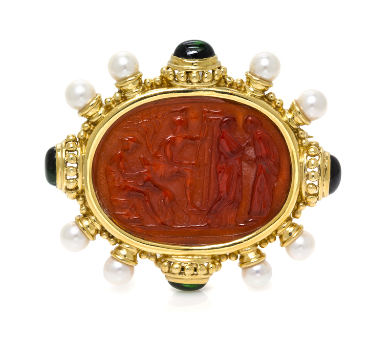 An 18 Karat Yellow Gold, Glass Cameo, Cultured Pearl, Chrome Diopside and Mother-of-Pearl Pendant/Brooch,