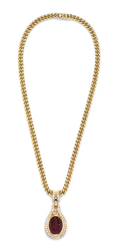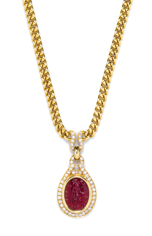consisting of a pendant containing an oval carnelian intaglio from the second century B.C. depicting the goddess Minerva set within a bezel setting and hinged bail containing 50 round brilliant and single cut diamonds weighing approximately 1.00 carat total.Pendant hand inscribed: MINERVA NIKE FORTUNA II CENTURY B.C. Clasp stamp: BVLGARI 750 (partially obscured number _949).Accompanied by a leather folder signed BVLGARI.