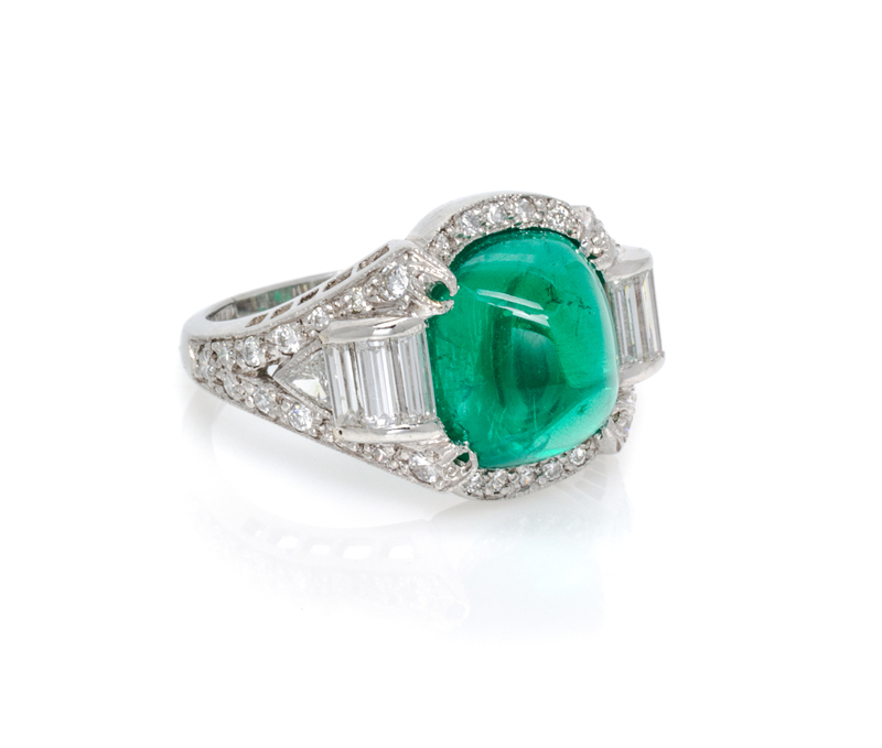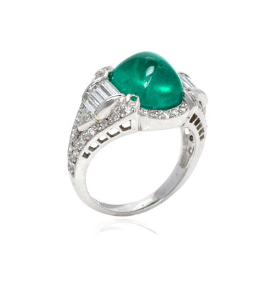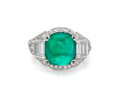 containing one sugarloaf cabochon cut emerald measuring approximately 10.25 x 9.71 x 7.12 mm, six baguette cut diamonds weighing approximately 0.40 carat total, two triangular brilliant cut diamonds weighing approximately 0.18 carat total, and 36 round brilliant cut diamonds weighing approximately 0.42 carat total.Stamp: PLATINUM.Accompanied by an American Gemological Laboratories emerald identification certificate number CS 71155, dated October 27, 2015, stating Mineral Type: Natural Beryl, Variety: Emerald, Clarity Enhancement: Insignificant, Traditional.