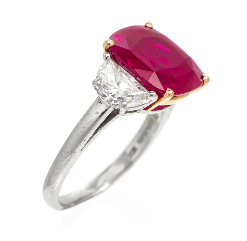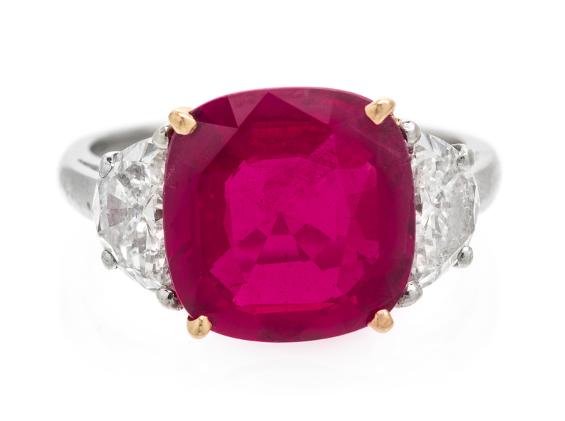containing one cushion cut ruby weighing approximately 6.05 carats and two half moon brilliant cut diamonds weighing approximately 1.50 carats total.Stamp: 301025 (maker's mark for Oscar Heyman Brothers) IRID. PLAT. 18K.Accompanied by a Gem Research Swisslab gemstone report number GRS2005-050821, dated May 18, 2005, stating: Natural Ruby, Weight: 6.05 Carats, Origin: Burma (Myanmar), Comments: Heat H(a), no surface cavity fillings.Accompanied by an Oscar Heyman Brothers certificate of authenticity, dated May 2006, stating the serial number 301025, the metals of 18 karat and platinum, and stones as 1 cushion Burma ruby weighing 6.05 carats and 2 half moon diamonds weighing 1.50 carats.