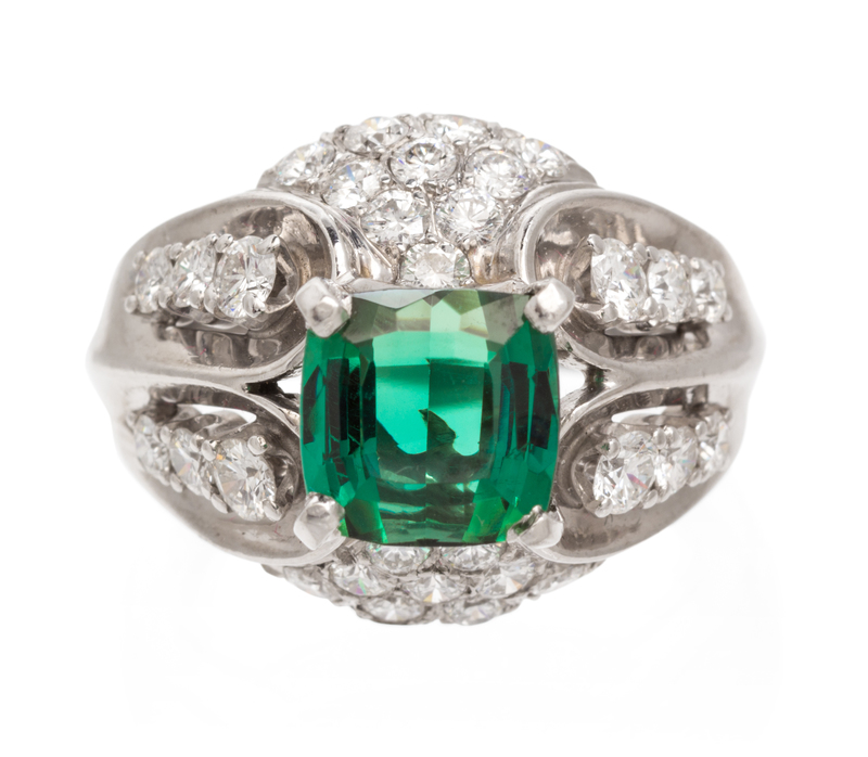 containing one cushion shape mixed cut green tourmaline measuring approximately 8.15 x 8.12 mm and 32 round brilliant cut diamonds weighing approximately 1.24 carats total.Stamp: LIT IRID CPLAT.
