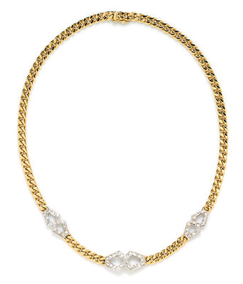 consisting of three white gold openwork geometric links containing numerous round single cut diamonds weighing approximately 0.75 carat total joined within the front half of the yellow gold curb link chain.Stamp: 750 GUCCI (partially obscured).