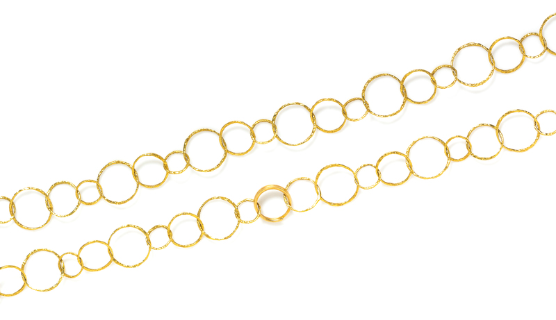 consisting of large circular links in a textured finish, convertable to a bracelet and shorter necklace.Stamp: 18K.