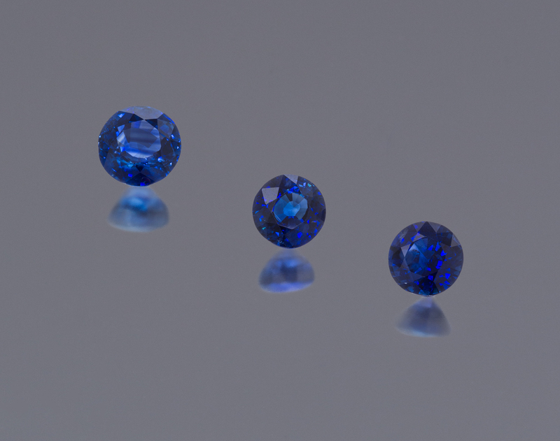 consisting of one round mixed cut sapphire measuring approximately 6.91 x 7.03 x 4.52 mm and weighing approximately 1.55 carats, one round mixed cut sapphire measuring approximately 7.64 x 7.59 x 4.72 mm and weighing approximately 1.90 carats, and one round mixed cut sapphire measuring approximately 6.78 x 6.71 x 4.97 mm and weighing approximately 1.70 carats.