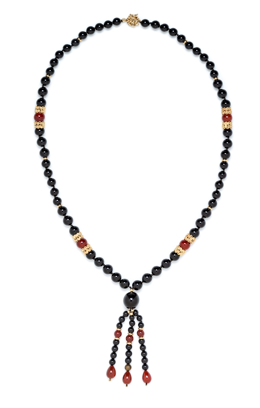 A 14 Karat Yellow Gold, Onyx and Carnelian Beaded Tassel Necklace,