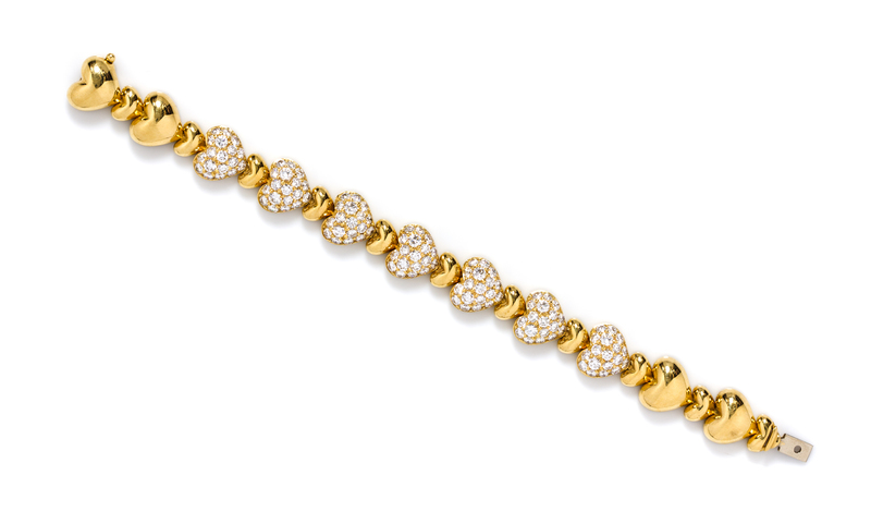 in a repeated domed heart shape link design, the center seven links pave set with 126 round brilliant cut diamonds weighing approximately 7.22 carats total.Stamp: 18K.