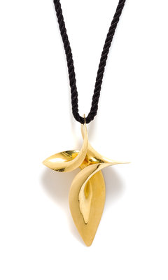 consisting of a abstract yellow gold cross pendant, suspended from a black cord with an 18 karat yellow gold clasp.Stamp: M. Good (maker's mark) 750.