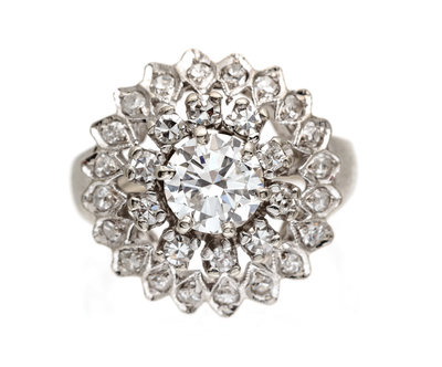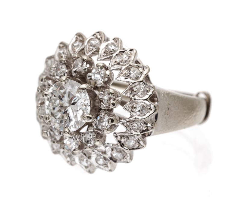 containing one transitional brilliant cut diamond weighing approximately 0.78 carat and 30 round single cut diamonds weighing approximately 0.40 carat total.Stamp: 14K.